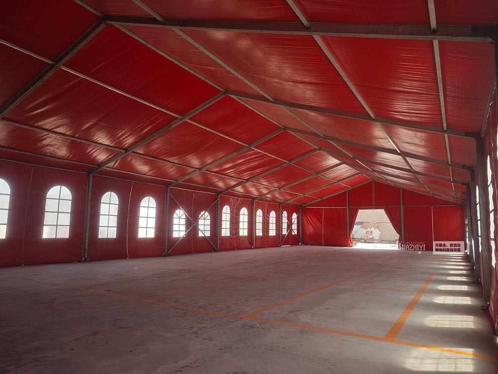婚慶篷房是夏季婚禮市場的熱門之選。以紅色篷房為例,其鮮艷色彩契合傳統婚慶氛圍,鋁合金框架搭配雙層PVC篷布。內部可靈活配置水晶吊燈、紗幔、地毯等裝飾,結合空調系統,打造舒適浪漫的婚禮空間。鄭州華熠公司曾為多場戶外婚禮提供此類篷房,滿足新人對時效與美學的雙重需求。