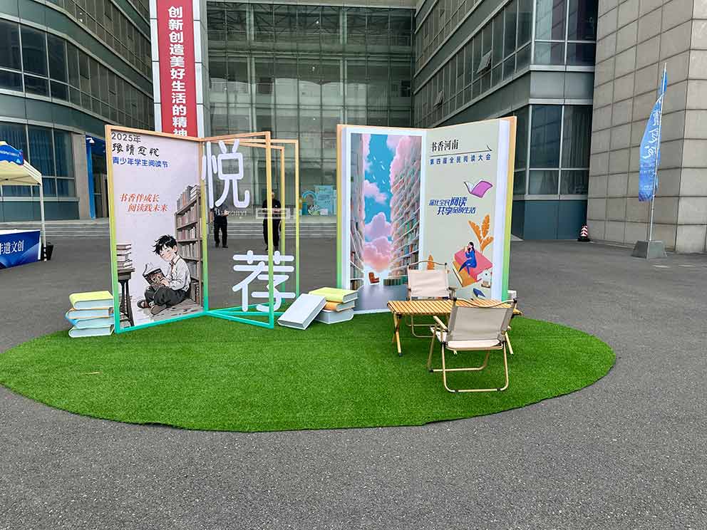 白色人字形帳篷是閱讀空間的核心載體。漯河篷房租賃選用的帳篷頂高 3 米,米白色的篷布經過防紫外線處理,既能遮擋正午的烈日,又不會隔絕外界的自然光線。帳篷四周沒有圍布,風穿過篷下時帶著淡淡的墨香,與遠處的綠植相映成趣,讓閱讀氛圍更顯清新。